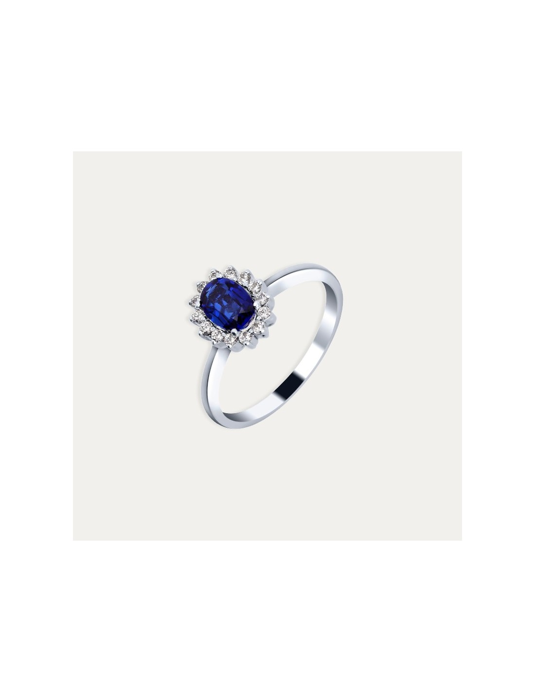 Sortija de oro blanco de 9 quilates con diamantes creados y zafiro natural.