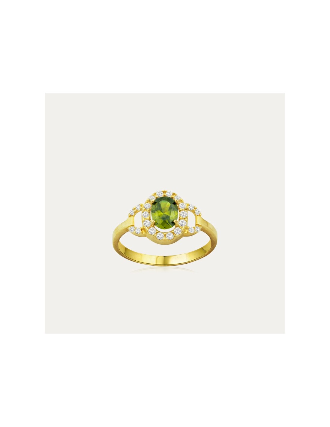 Anillo en Oro de 9 kilates con una piedra grande de color Olivina y circonitas blancas en el borde. Esta pieza combina perfectamente con los pendientes de nombre Zadar.