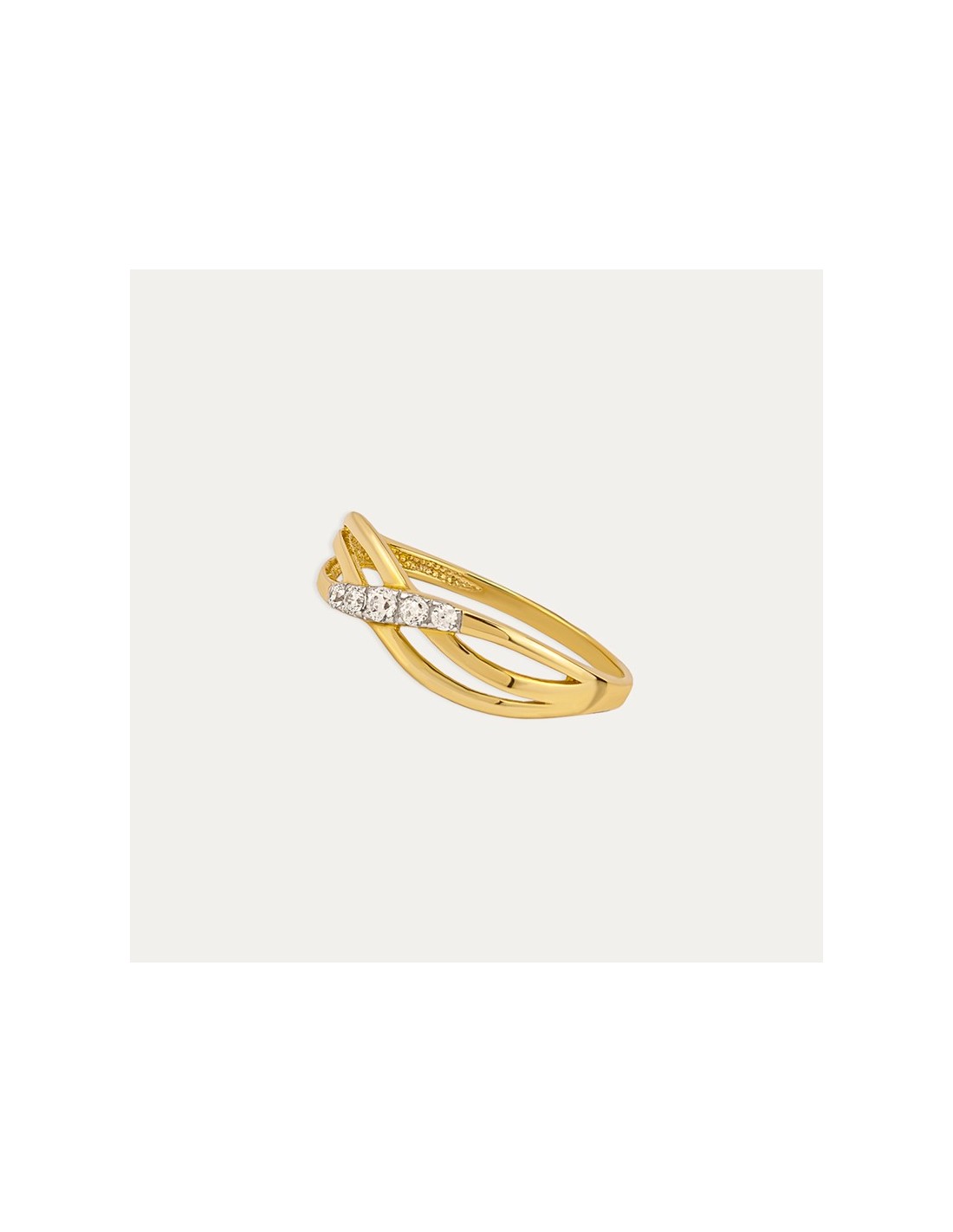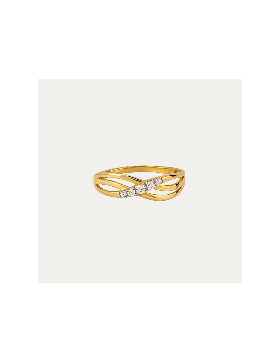 Anillo de oro amarillo de 9 quilates con 5 circonitas y detalles entrelazados. Una sortija para disfrutar a diario.