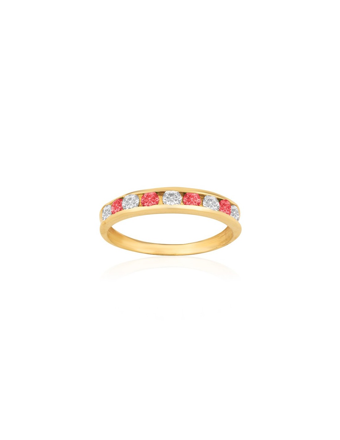 Sortija en Oro 9 kilates con carril de circonita Rubí y blanca.