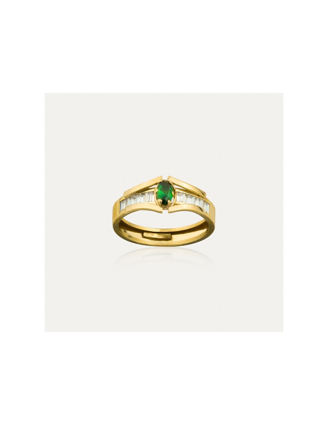 Anillo en Oro 9 quilates, con circonitas en carril y piedra central color esmeralda.