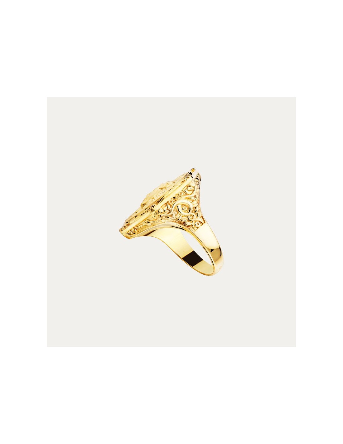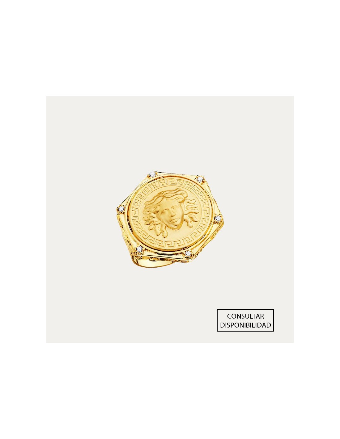 Sortija en Oro de 18 kilates con forma hexagonal decorada con la cara de medusa en relieve además de 6 circonitas en cada esquina, con textura de greca y detalles grabados en ambos brazos.