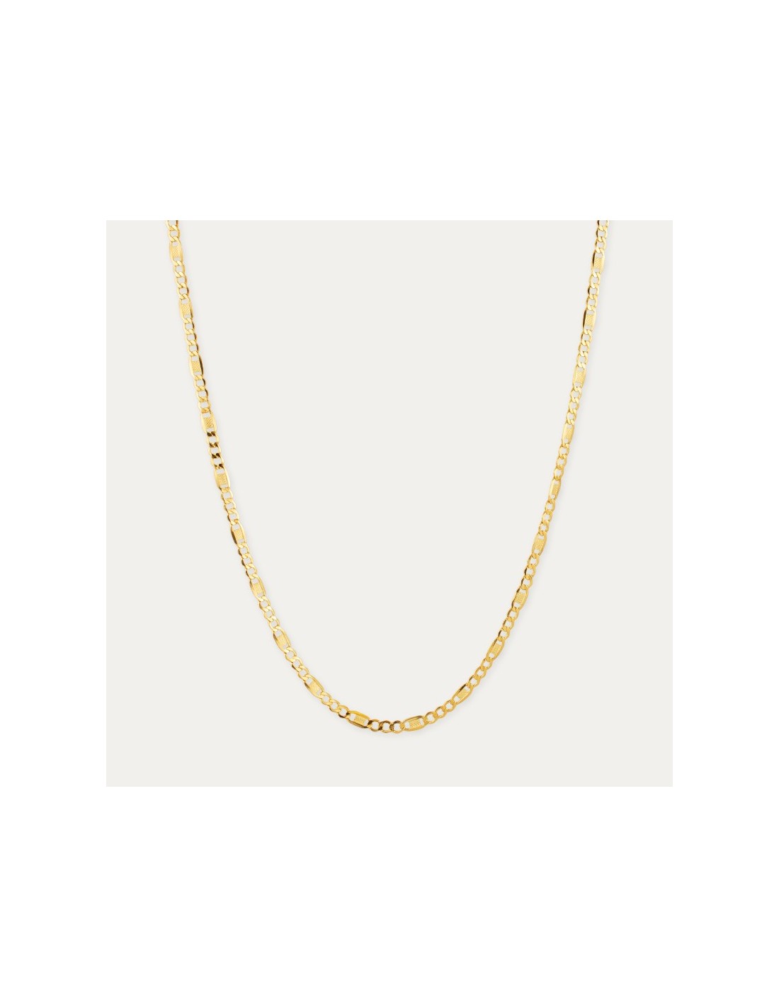 Cadena fabricada en Oro de 9 kilates de eslabón tres por uno combinado, una pieza ideal para ponerla sola o con un colgante.