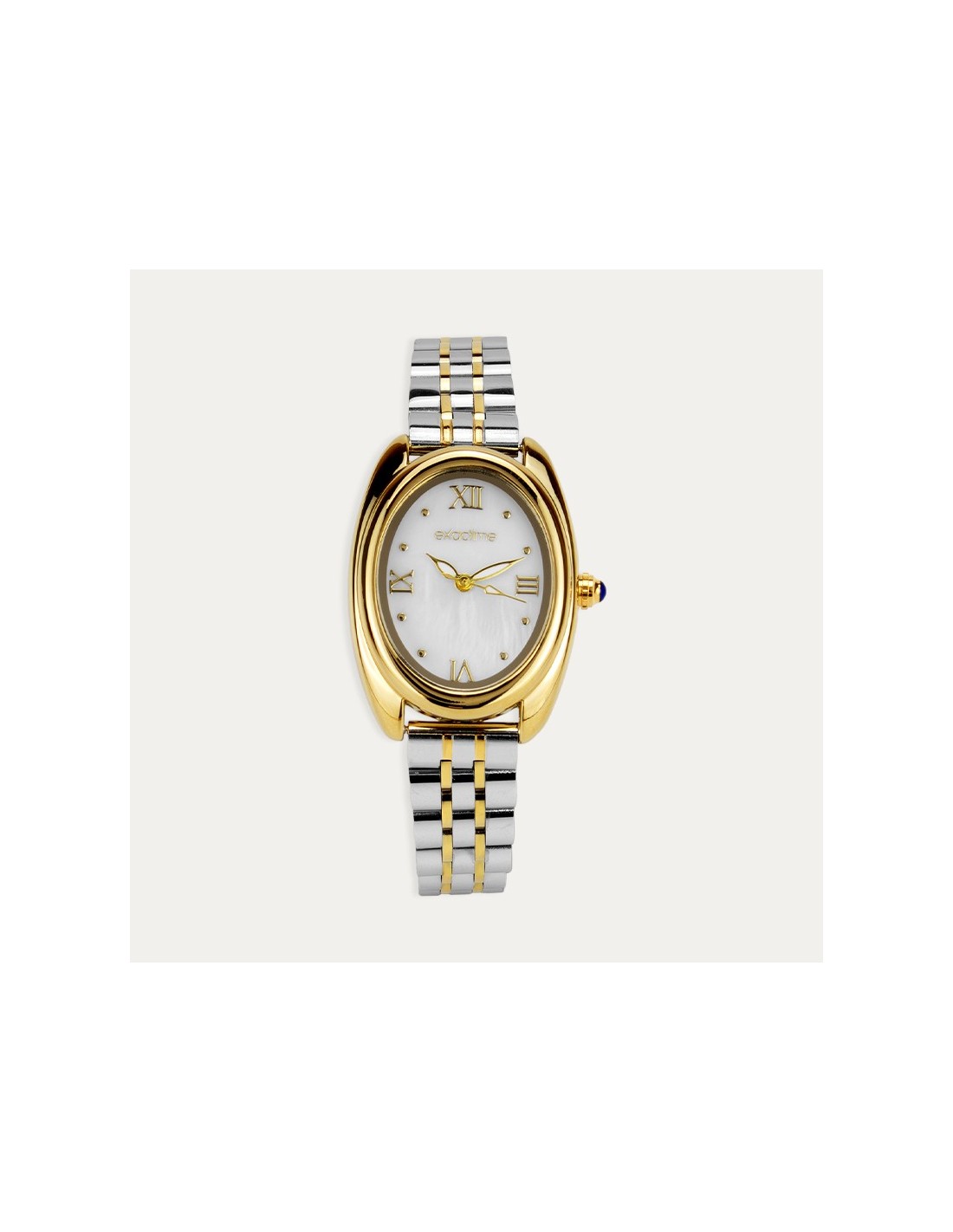 Reloj en acero bicolor con correa tipo armis, con esfera ovalada en blanco para mujer con números romanos.