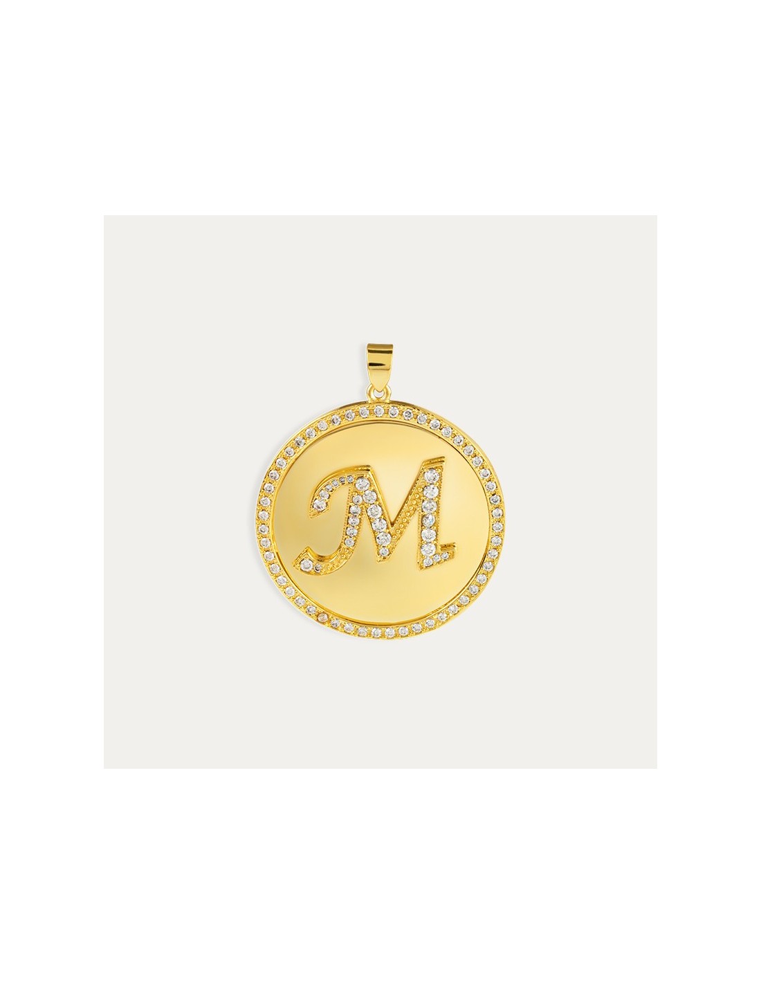 Colgante personalizado fabricado en Oro de 18 kilates con inicial y decorado de circonitas, el acabado interior es en acabado brillo.
