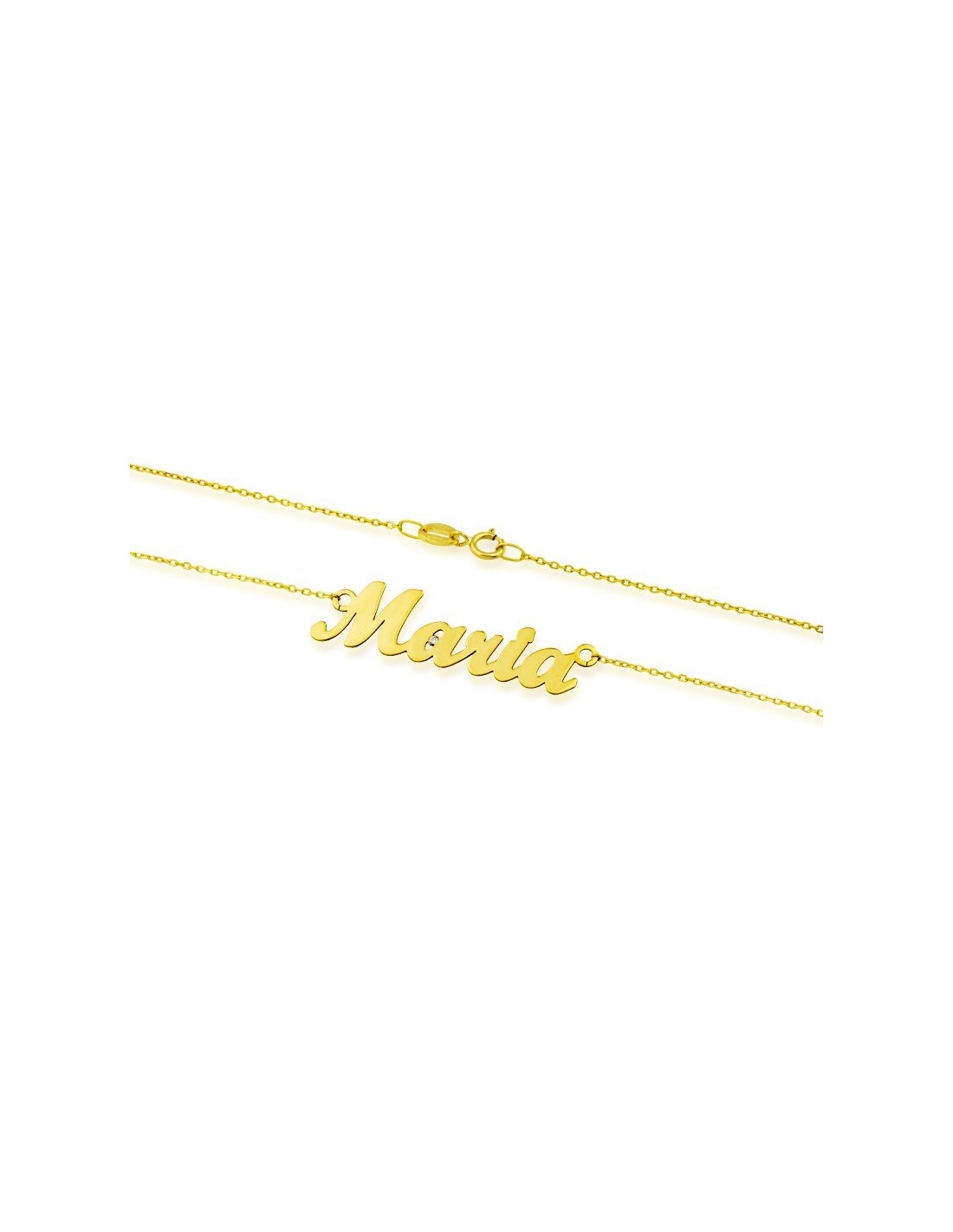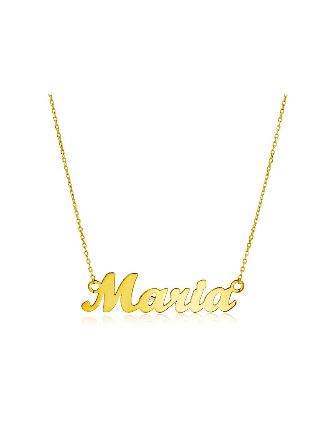 Gargantilla para personalizar con nombre y circonita en oro amarillo de 18 kilates. La gargantilla tiene 40cm de largo y el eslabón 1mm de ancho. El tamaño de la letra minúscula es de 6mm de alto.