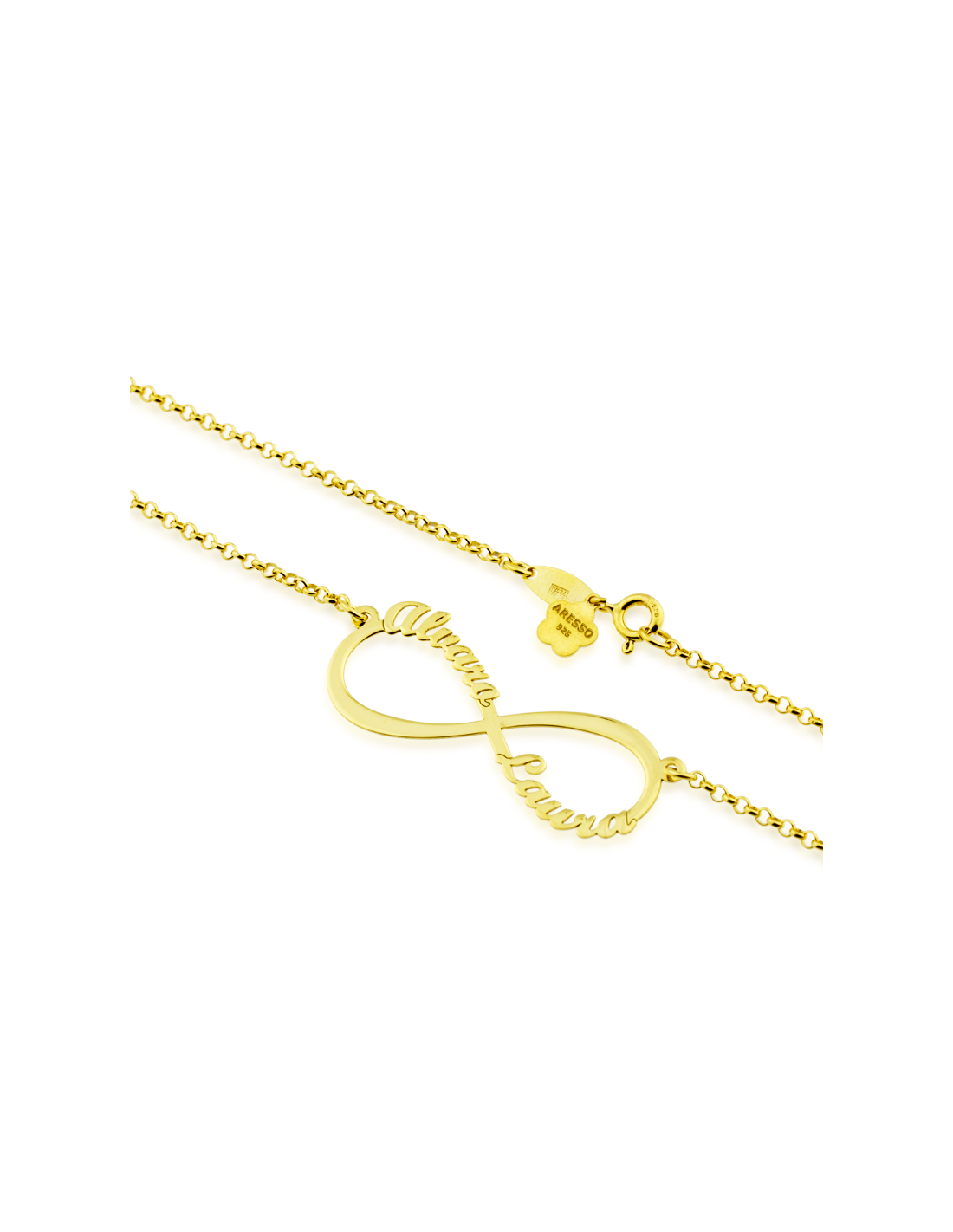 Gargantilla con forma de infinito personalizado con nombres en Oro 18k. No se pueden grabar acentos.