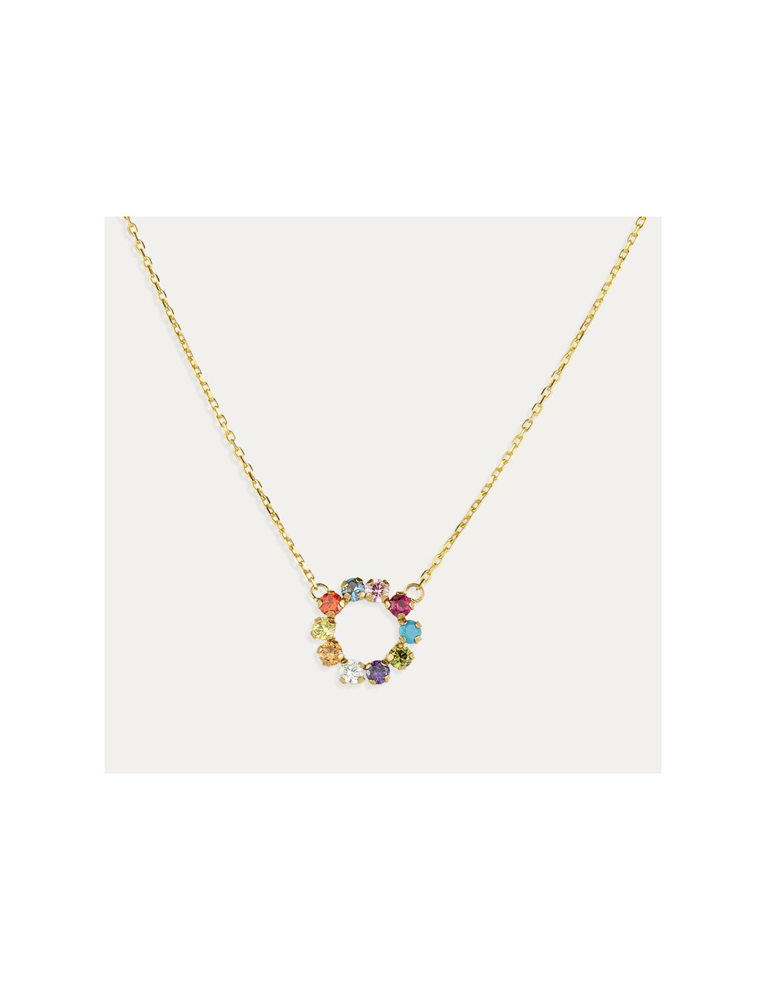 Gargantillo fabricada en Oro de 9 kilates con un círculo repleto de piedras de diferentes colores. Una joya llamativa, elegante y colorida que aporta un toque divertido y juvenil a tu look.