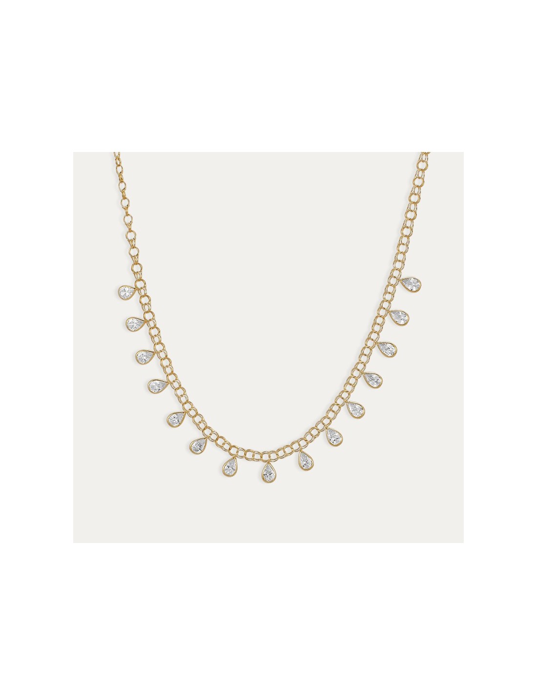 Collar fabricado en oro de 9 kilates con eslabón tipo hungarino y decorado circonitas en forma de lágrima.