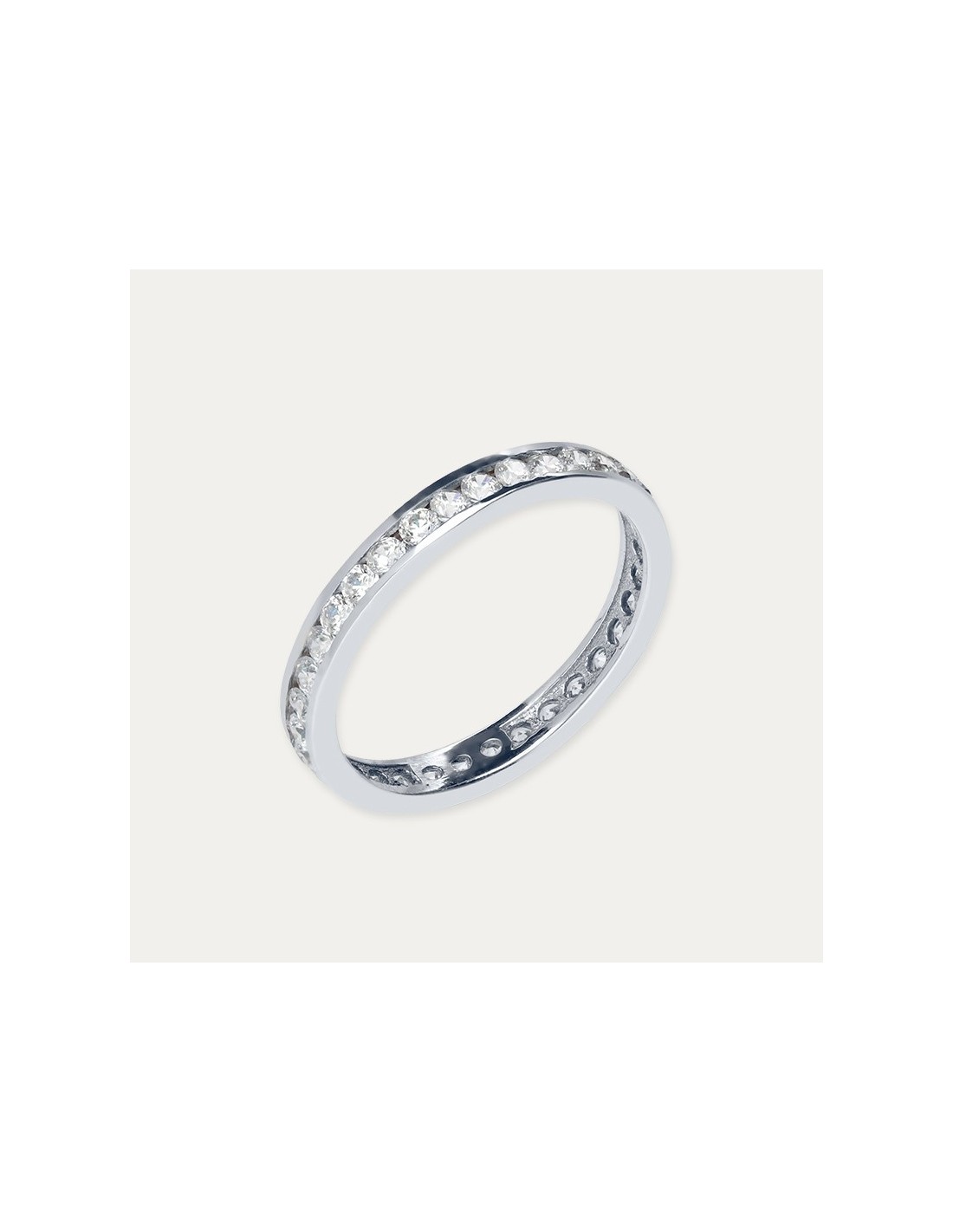 Sortija en Oro 18 kilates blanco con diamantes creados que forman una línea que cubre todo el anillo.