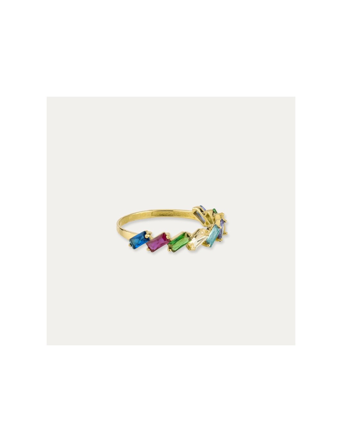 Sortija en Oro de 9 kilates con piedras de color tipo baguette en diagonal. Una joya colorida y divertida que aporta un estilo especial a tu look.