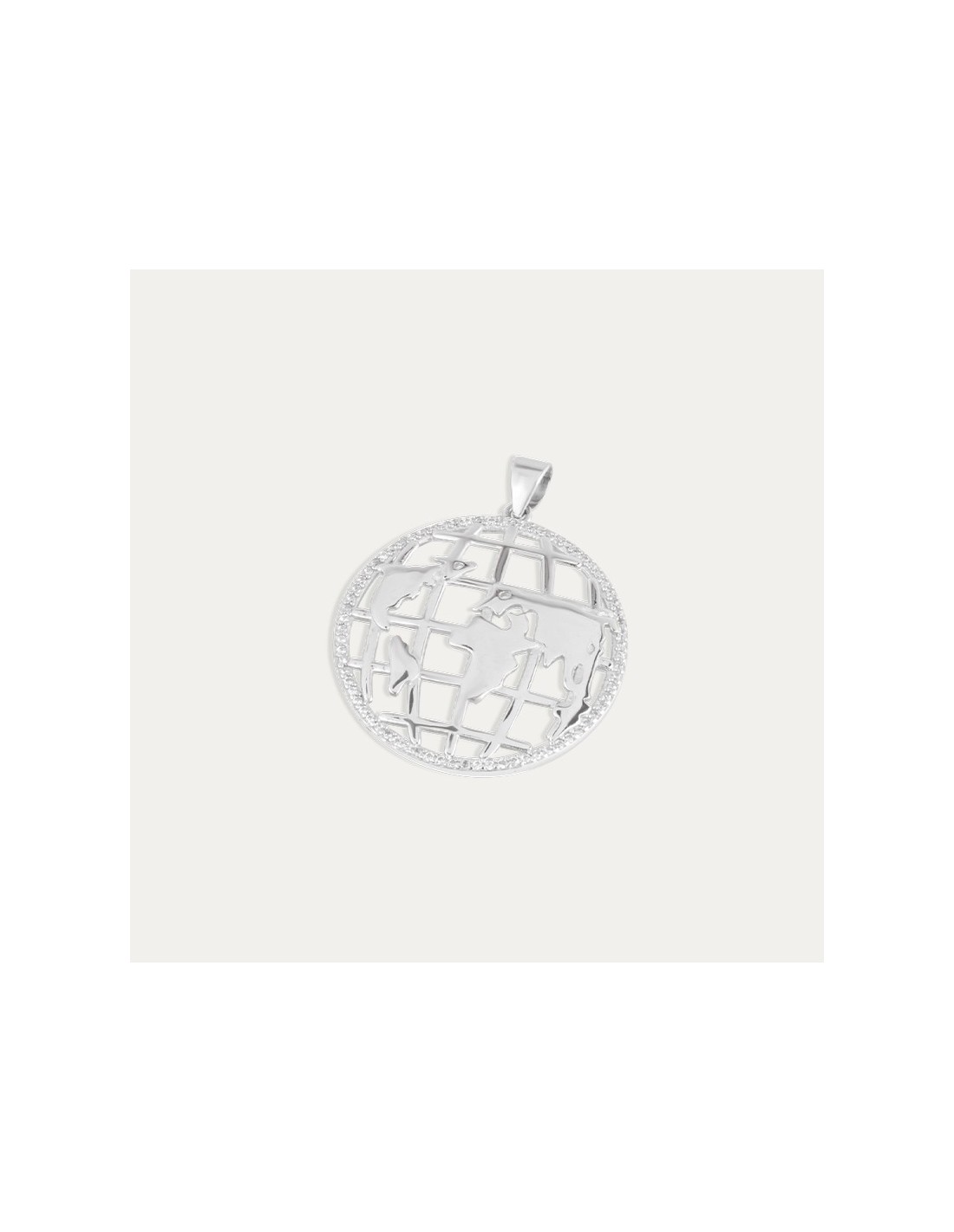 Colgante de Plata con motivo de globo terráqueo en forma circular con circonitas decorando el borde.