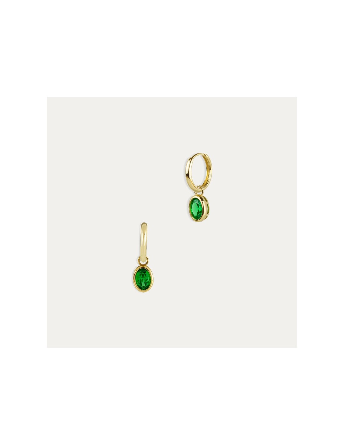Pendientes de aro en Oro de 9 kilates con piedra de color esmeralda en forma de ovalada colgada. En la colección Olive podrás encontrar colgantes, pendientes y sortijas para combinar.