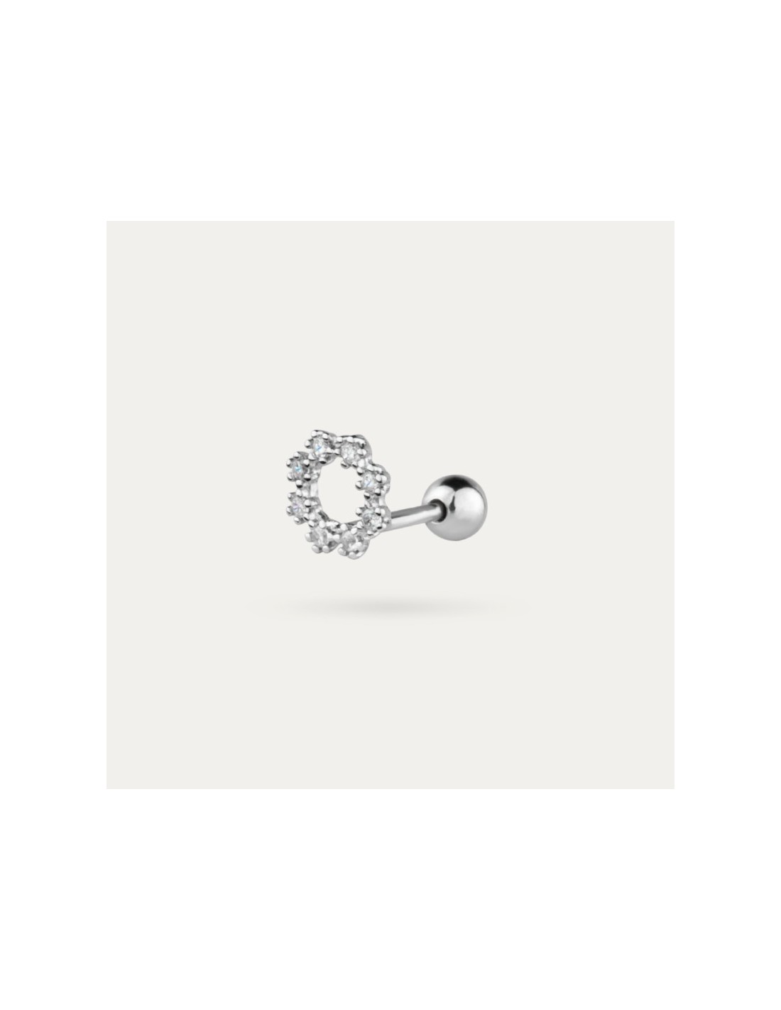 Pendiente estilo piercing de bola con rosca, fabricado en Plata de Primera Ley con circonitas formando un circulo. Un complemento versátil y que podrás utilizar en tu día a día.