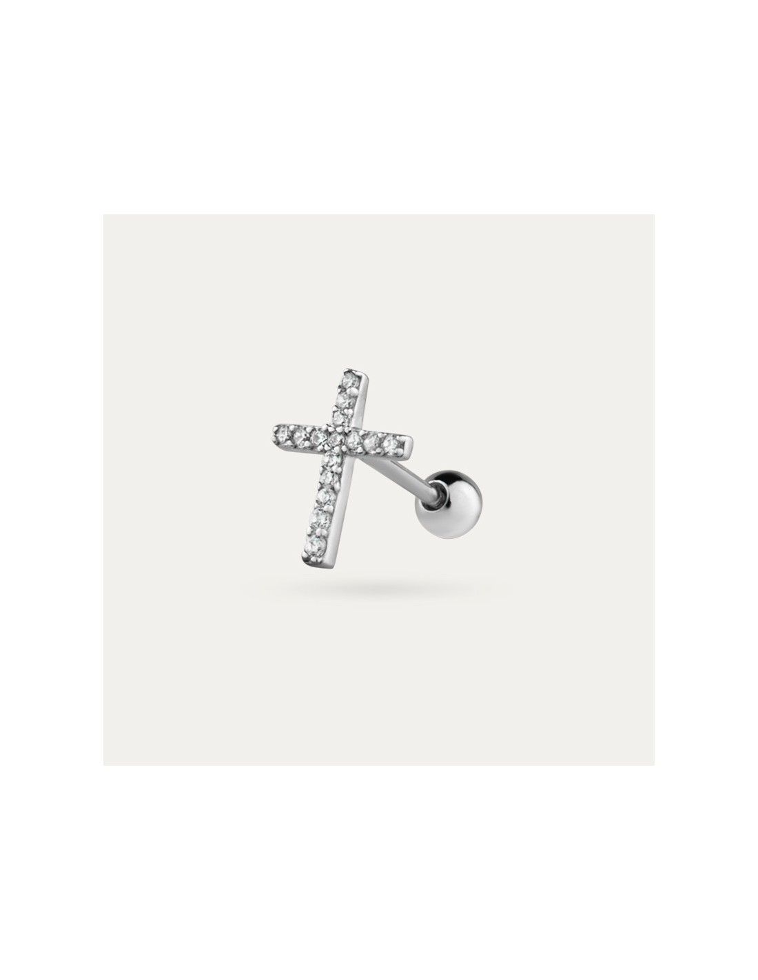 Pendiente tipo piercing con motivo de cruz llena de circonitas, fabricado en Plata de Primera Ley con cierre de tipo bola.