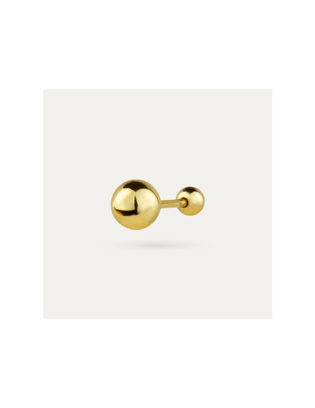 Pendientes tipo piercing en Plata de Primera Ley dorada con motivo de bola grande y cierre de rosca en bola más pequeña. Complemento ideal para combinarlo con otros pendientes y completar tu look.