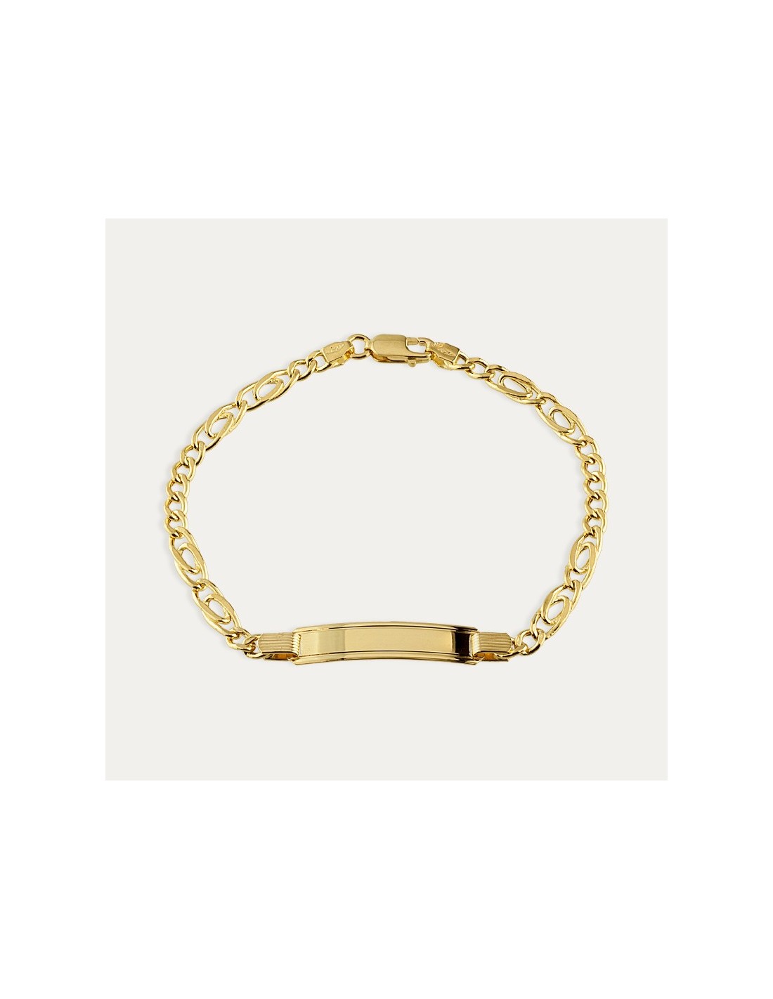 Pulsera fabricada en Oro de 18 kilates con eslabón combinado y una chapa en oro ideal para personalizar con una grabación.