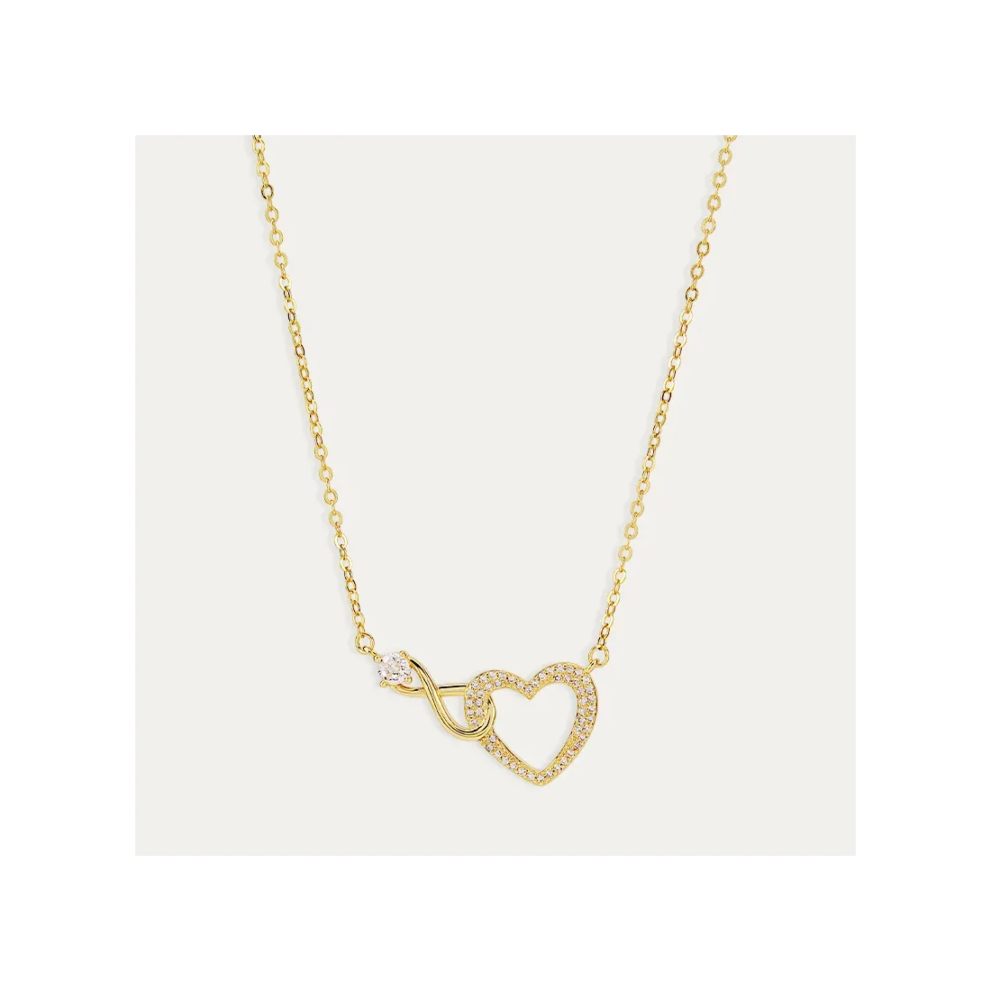 Unidades limitadas. Collar con forma de infinito y corazón entrelazados acompañado de circonitas que le dan un toque de brillo a la joya.