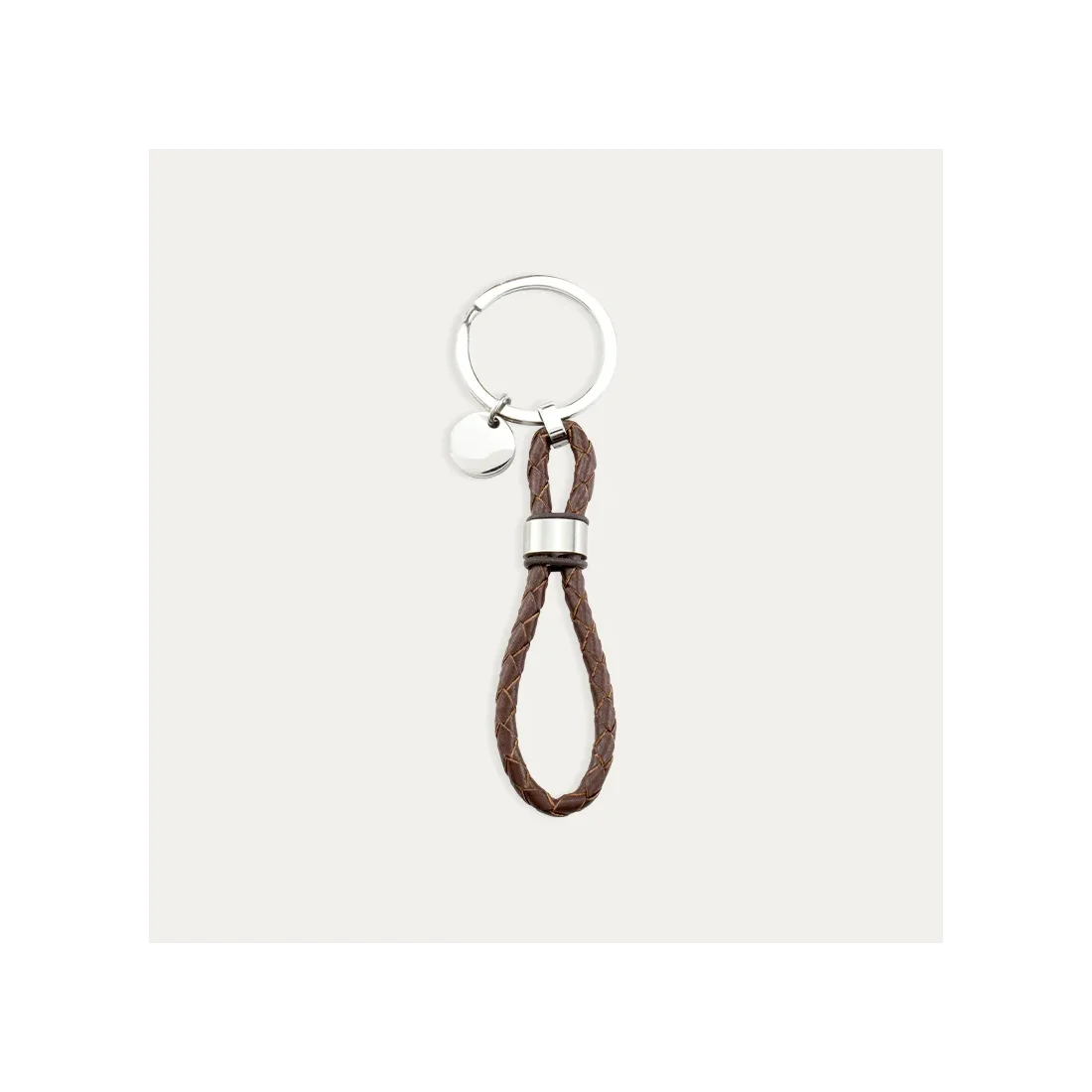 Llavero en acero con un disco personalizable y una correa trenzada marrón.