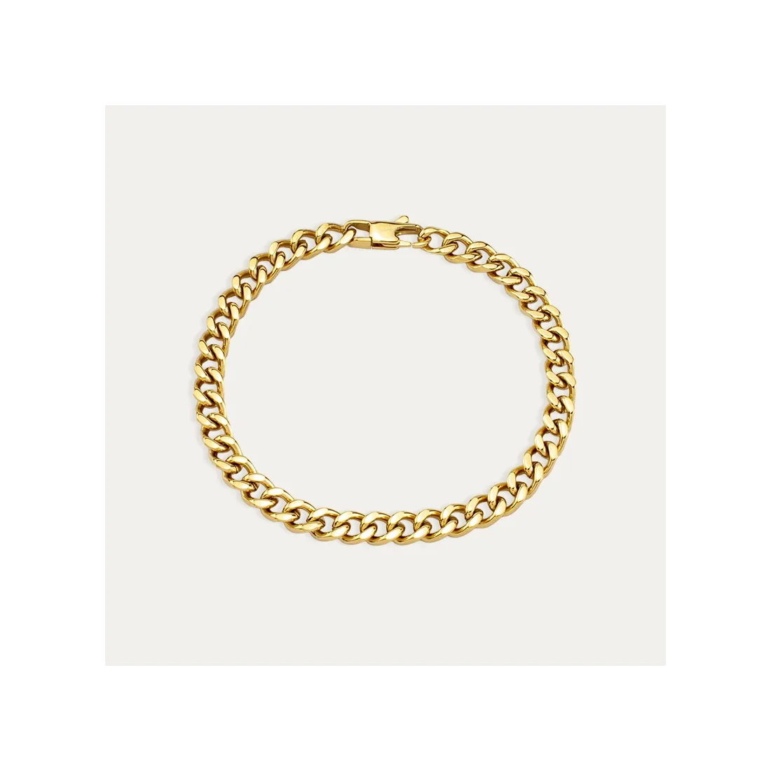 Pulsera fabricada en acero con acabado dorado de eslabón barbado, ideal para combinar con cualquier estilo y resistente para llevar a diario.