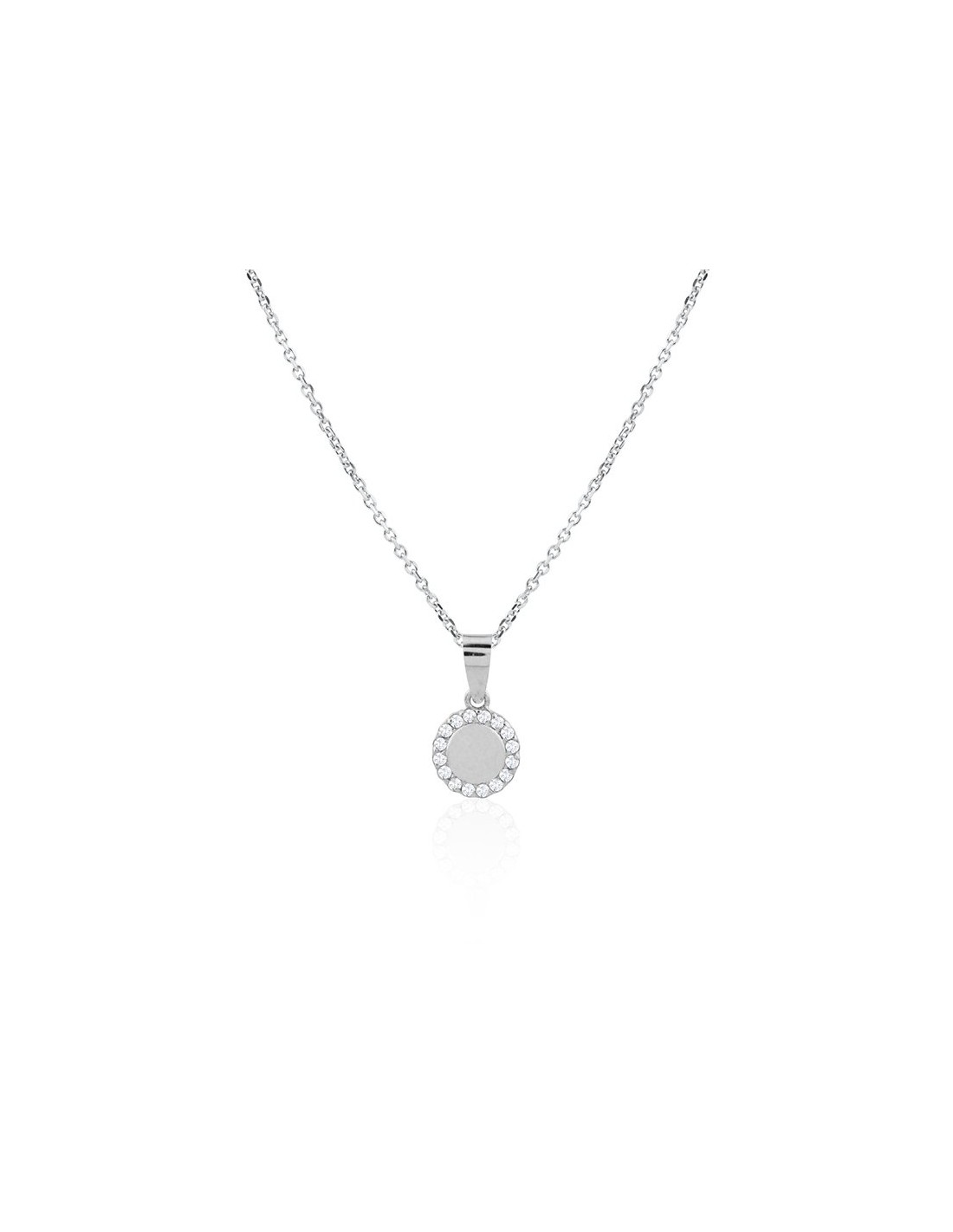 Cadena más colgante circular en oro de 9 kilates blanco en acabado brillo con diamantes engastados en el exterior.