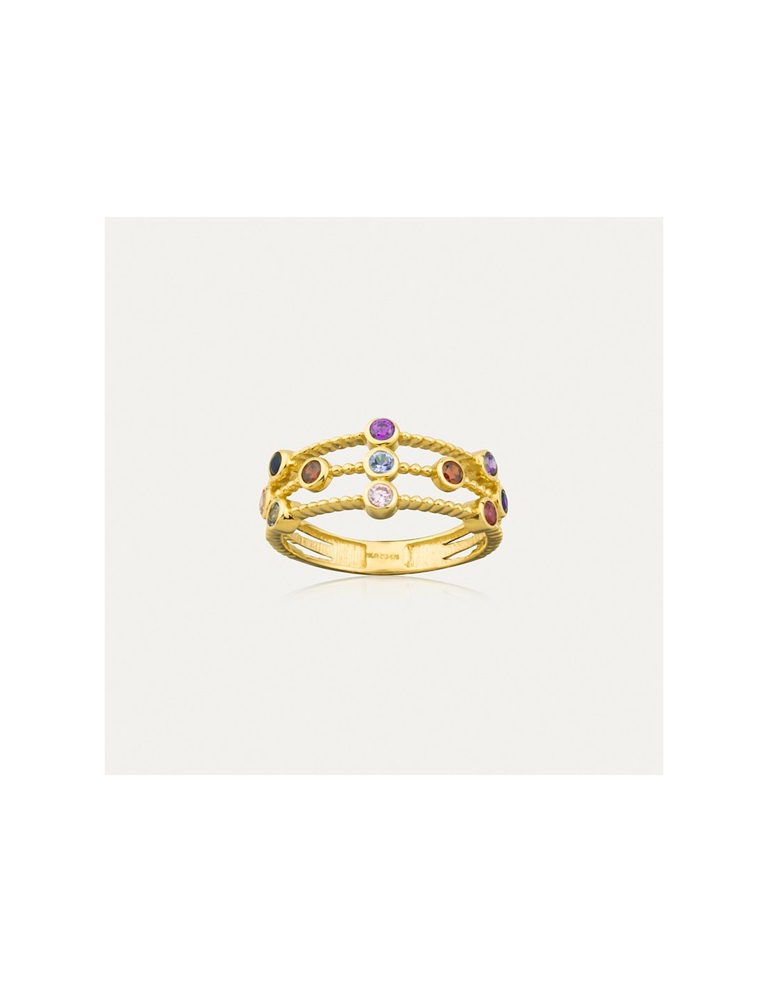 Anillo en Oro 18k, con piedras de color en su cabeza unidas entre sí por unos brazos formando un patrón. Un complemento que encaja con cualquiera de tus outfits.