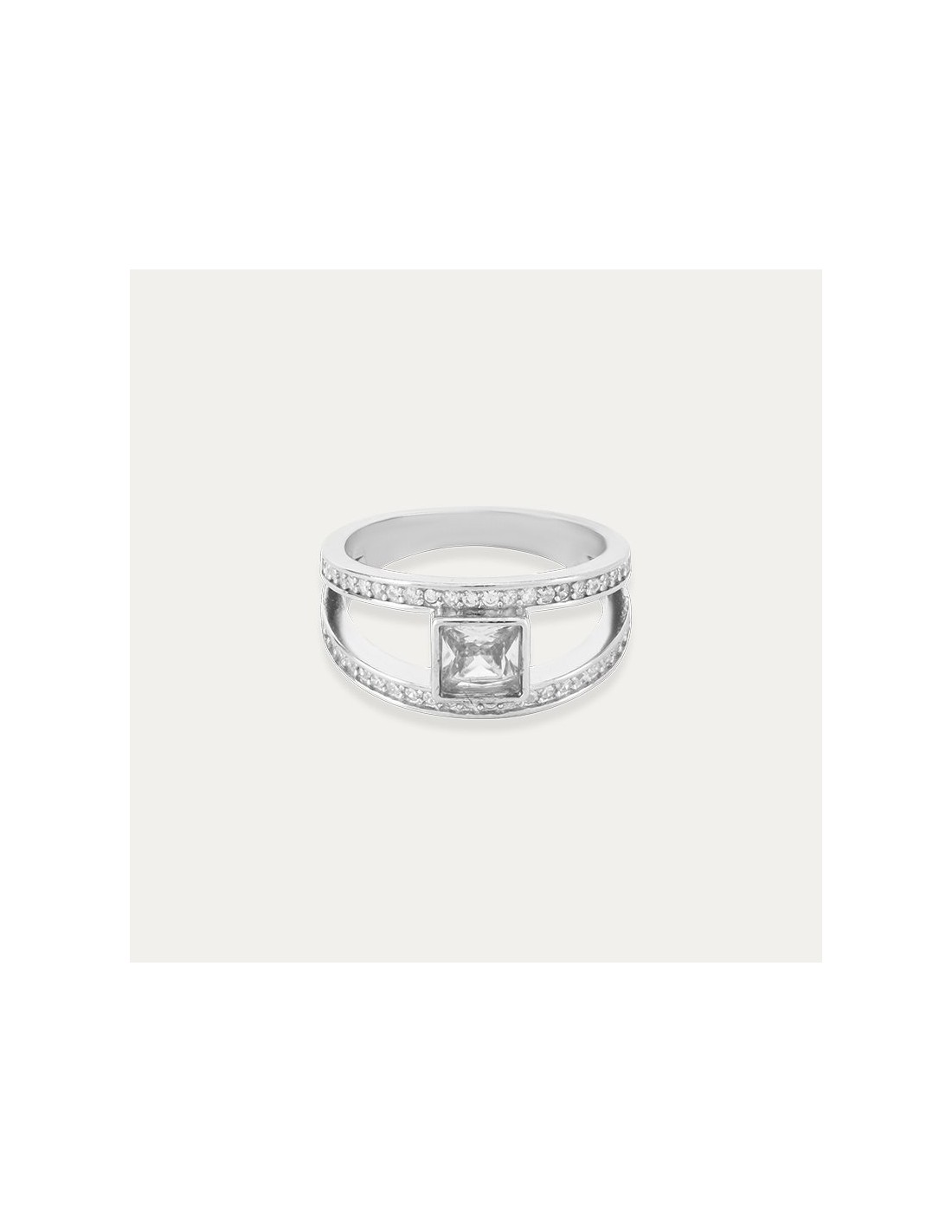 Anillo de Plata de Primera Ley con circonitas. Con los brazos divididos en dos y una gran piedra en el centro la cual no dejará de brillar en tu dedo.