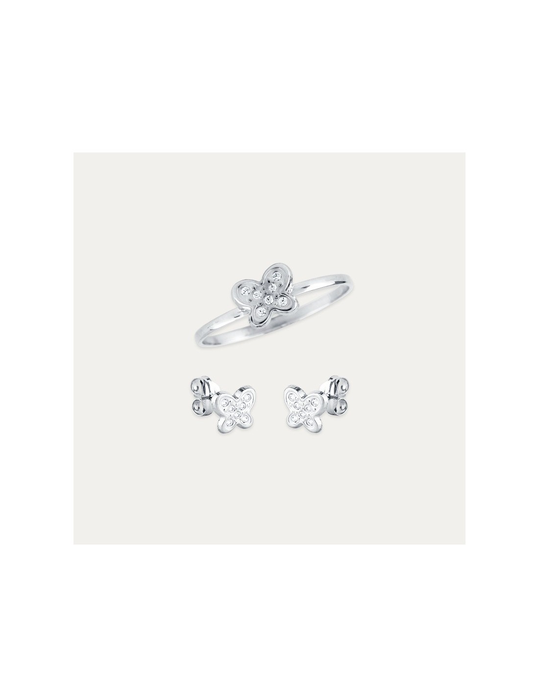 Sortija y pendientes a juego en Oro 18 kilates blanco con circonitas y motivo de mariposa. Joyas con estilo único perfectas para completar el look de Primera Comunión.