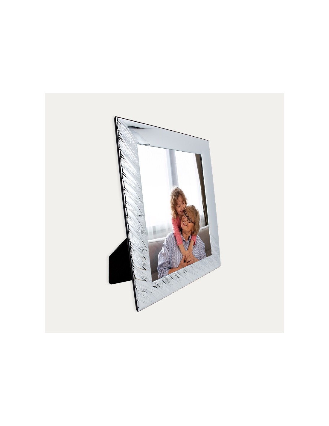 Marco en Plata Primera Ley con acabado de ondas en la mitad que contrasta con su otra mitad en brillo pulido. Un Complemento ideal para poner tus fotos favoritas.
