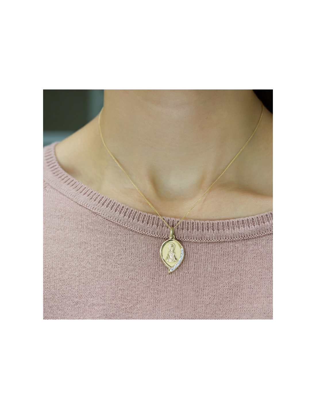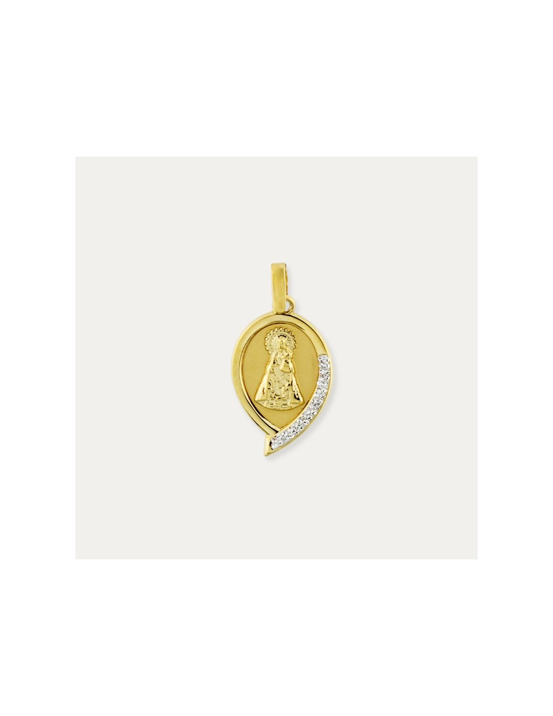 Medalla con forma de lágrima de la Virgen de los desamparados con detalle de circonitas.