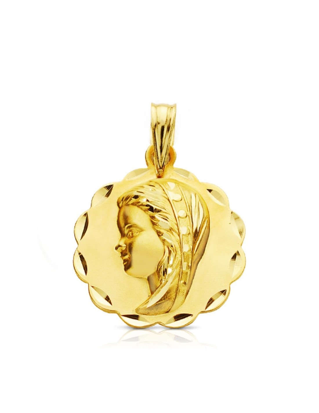 Medalla infantil en Oro amarillo 9 quilates con la Virgen en relieve y con con los bordes labrados.