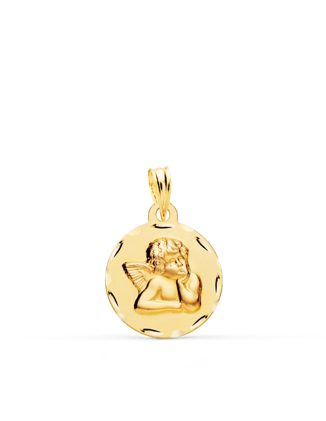 Medalla infantil en Oro amarillo 9 quilates con relieve de ángel y con forma circular con borde labrado.