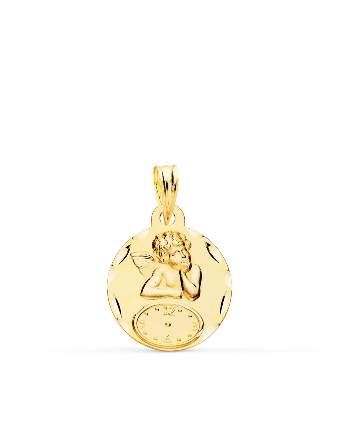 Medalla circular en Oro 9 quilates con motivo de Ángel y reloj para grabar hora.