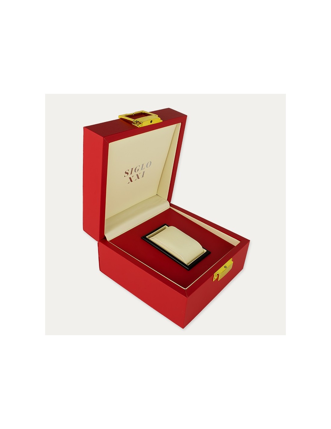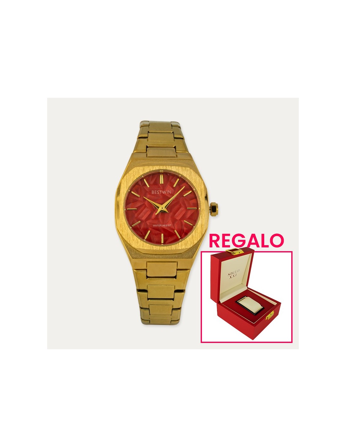 Pack de reloj de señora en acero dorado, esfera roja con relieve y correa estilo armis. Llevarte de regalo esta lujosa caja en color rojo a juego con tu reloj.