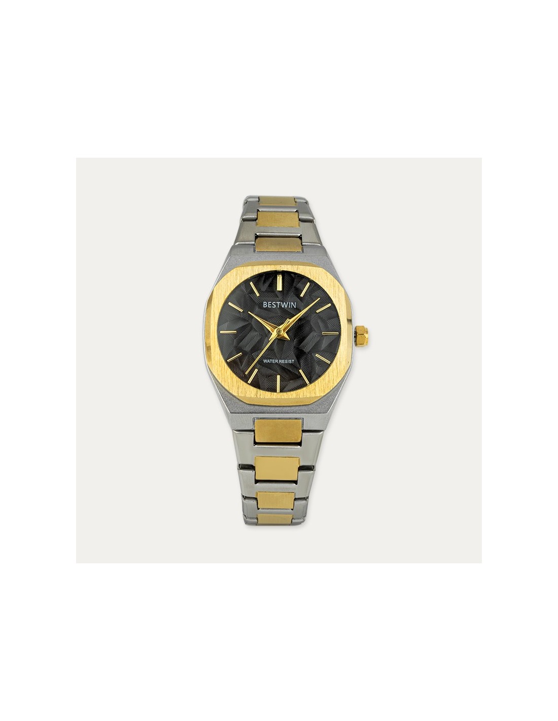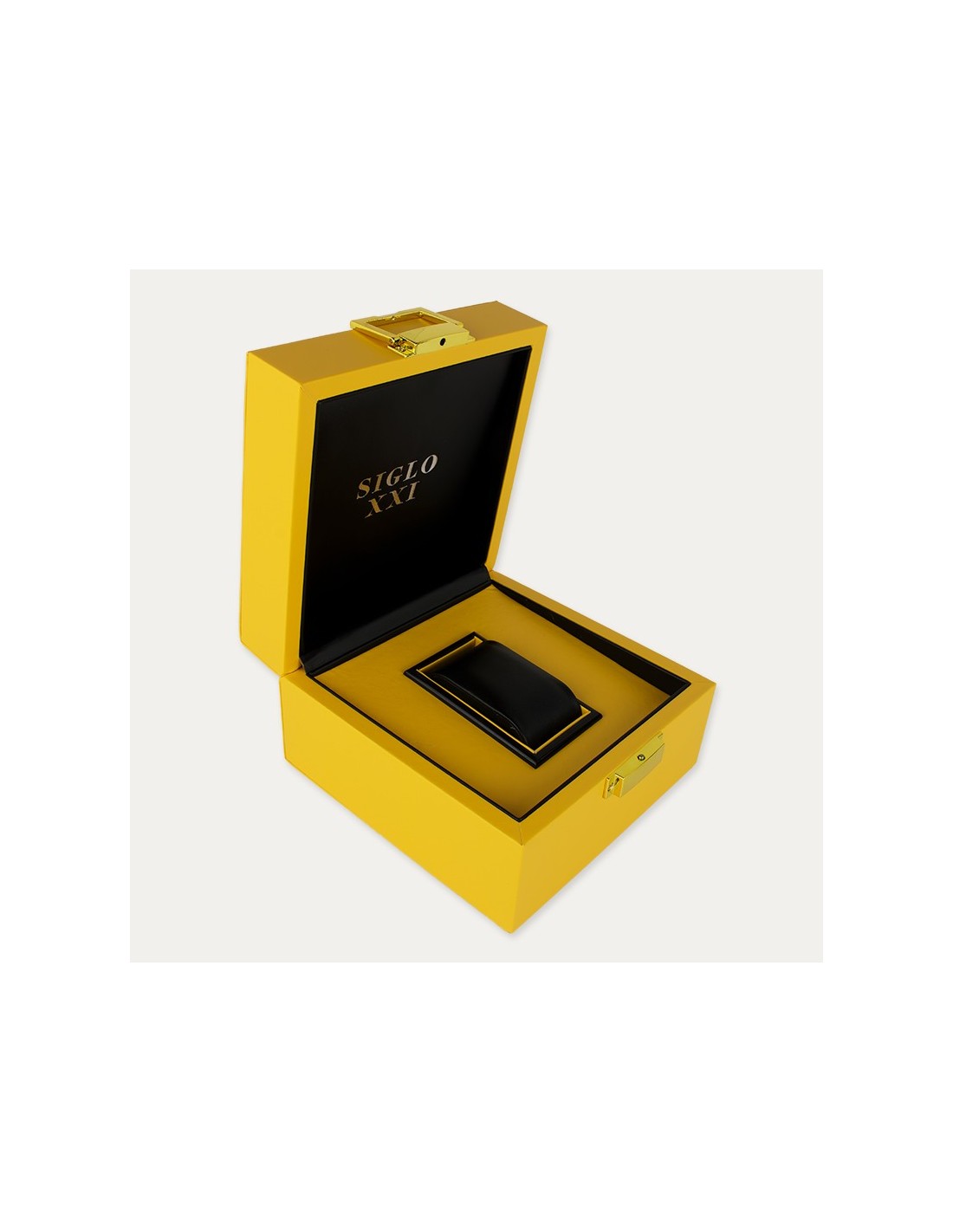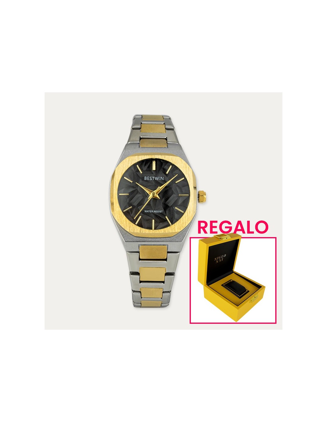 Pack de reloj de señora en acero bicolor, esfera negra con relieve y correa estilo armis. Llevarte de regalo esta lujosa caja en color amarillo mostaza a juego con tu reloj.