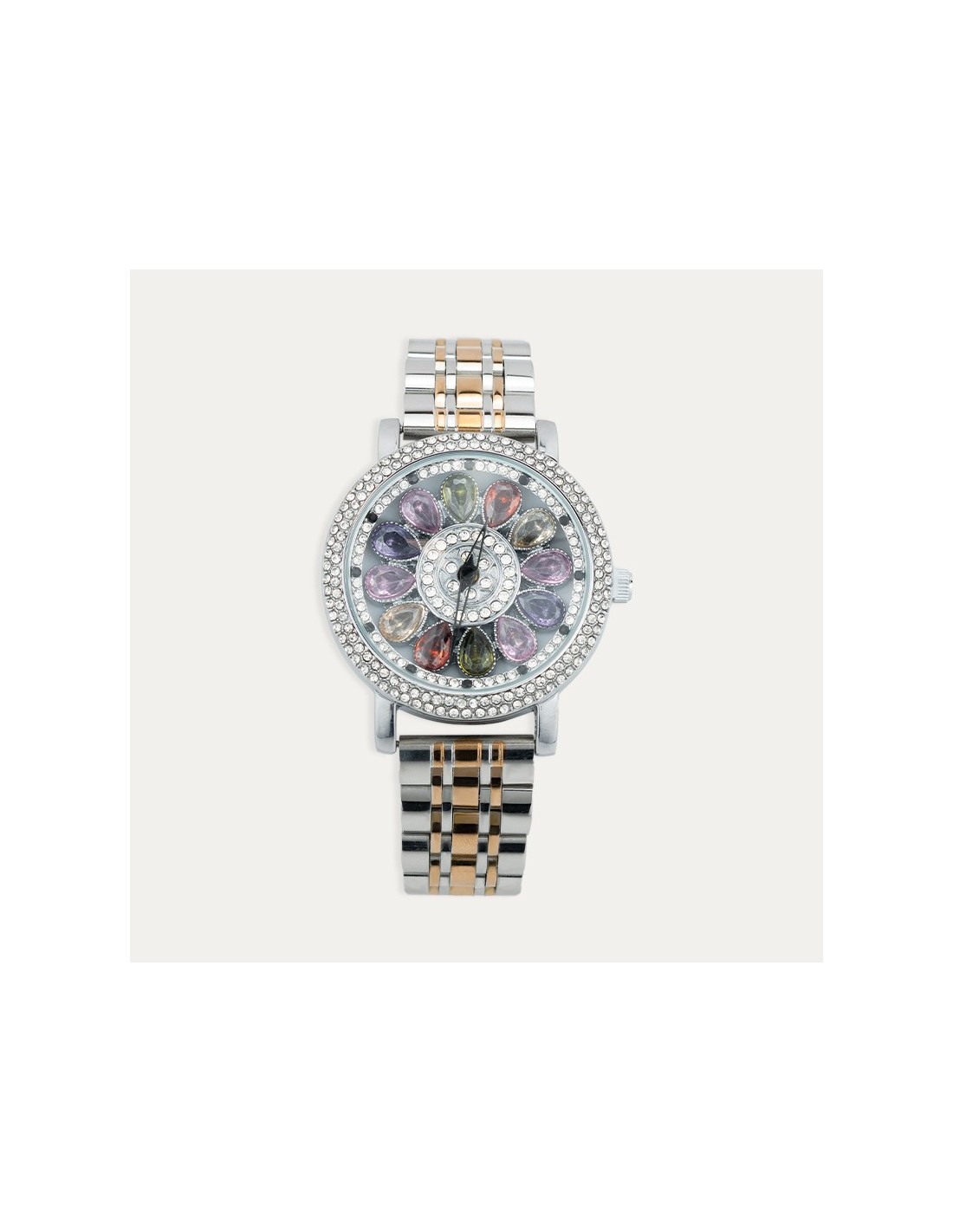 Reloj de acero bicolor con detalles en rosa y una esfera giratoria con piedras de color y circonitas. Diseño original y llamativo con el que completar el regalo para el Día de la Madre.