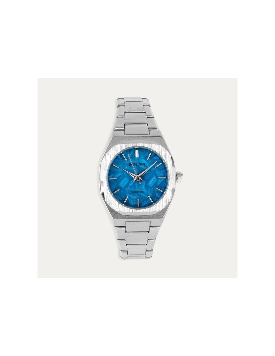 Reloj para mujer en acero de la marca Bestwin con esfera en color azul con acabado de textura. El pack incluye una regalo de masajeador facial en forma de corazón de silicona con varios modos que te facilitaran el cuidado de tu piel.