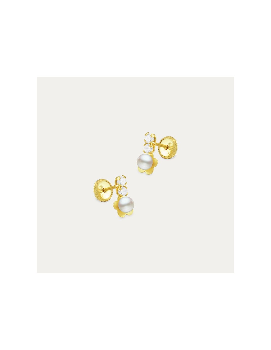 Pendientes en Oro de 18 quilates cortos con dos circonitas acabados con una perlita. Ideal para un detalle en un día muy especial.