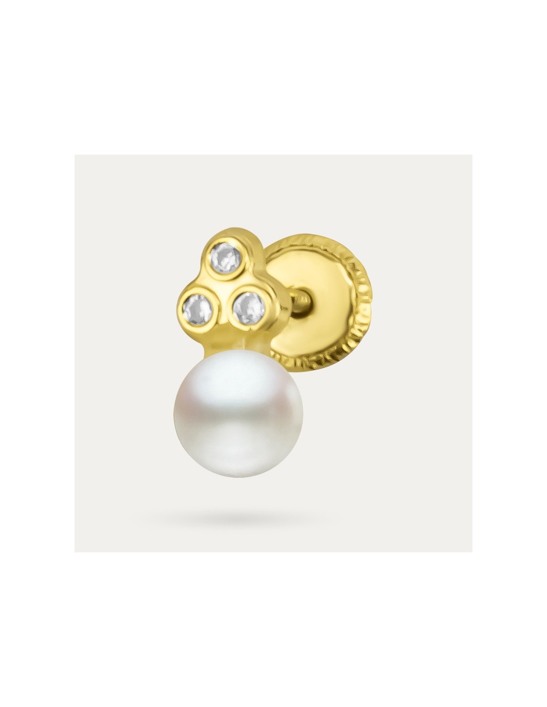 Pendientes en Oro de 18 quilates cortos con tres piedras en un trébol acabados con una perlita. Ideal para un detalle en un día muy especial.