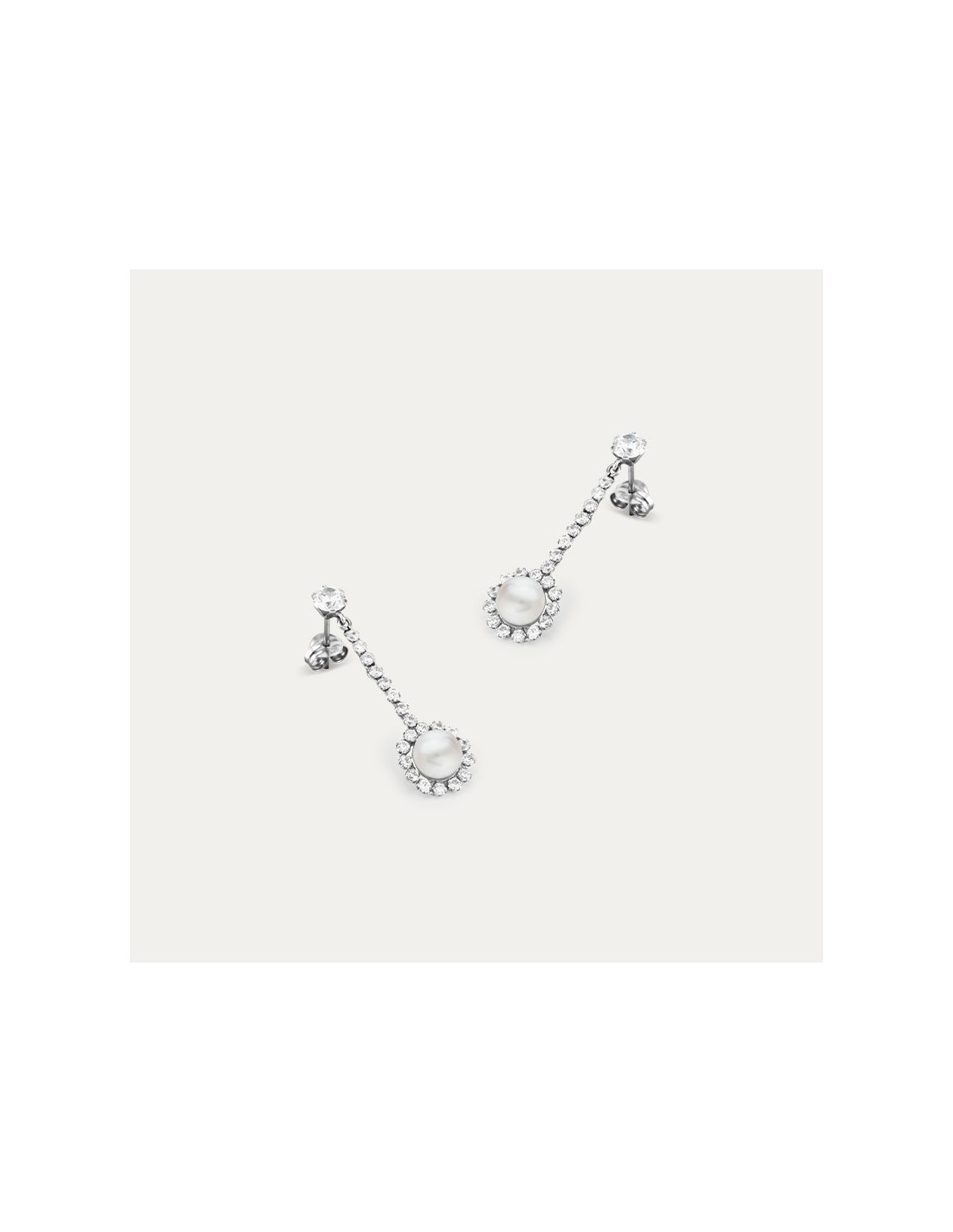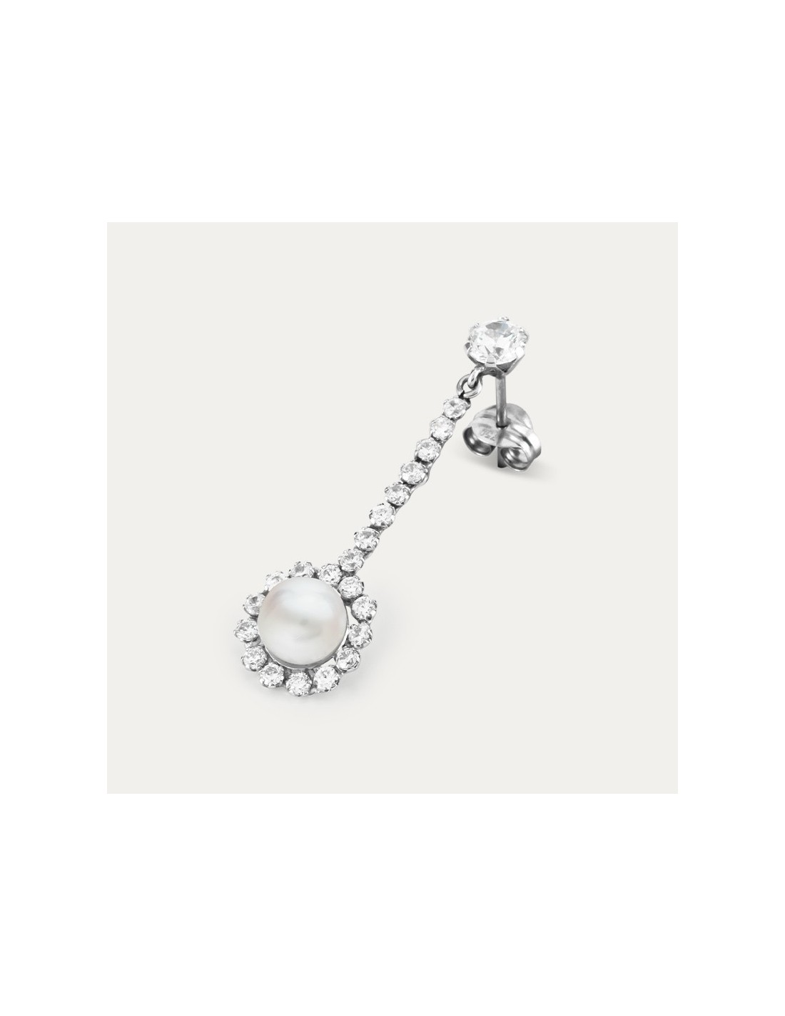 Pendientes en Oro Blanco de 18 quilates largos colgantes con forma circular y una perla en el centro. Preciosos pendientes para sorprender. Colección NOVIA.
