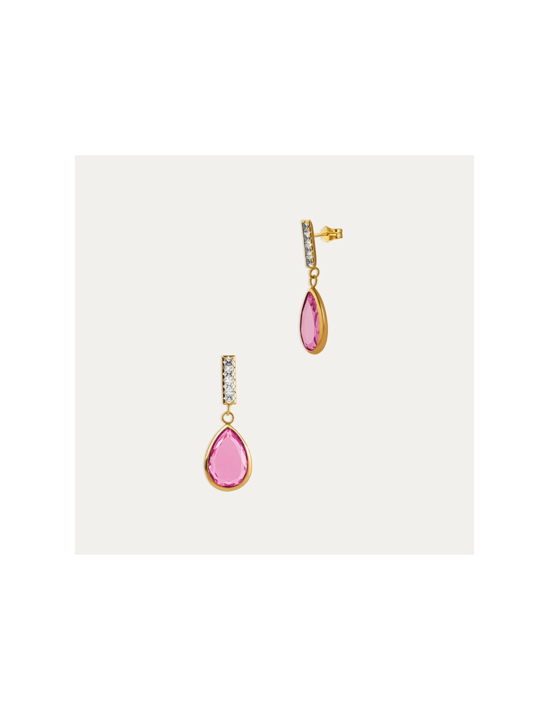 Pendientes de colgar en forma de lágrima o gota en color rosa y una cascada de circonitas.