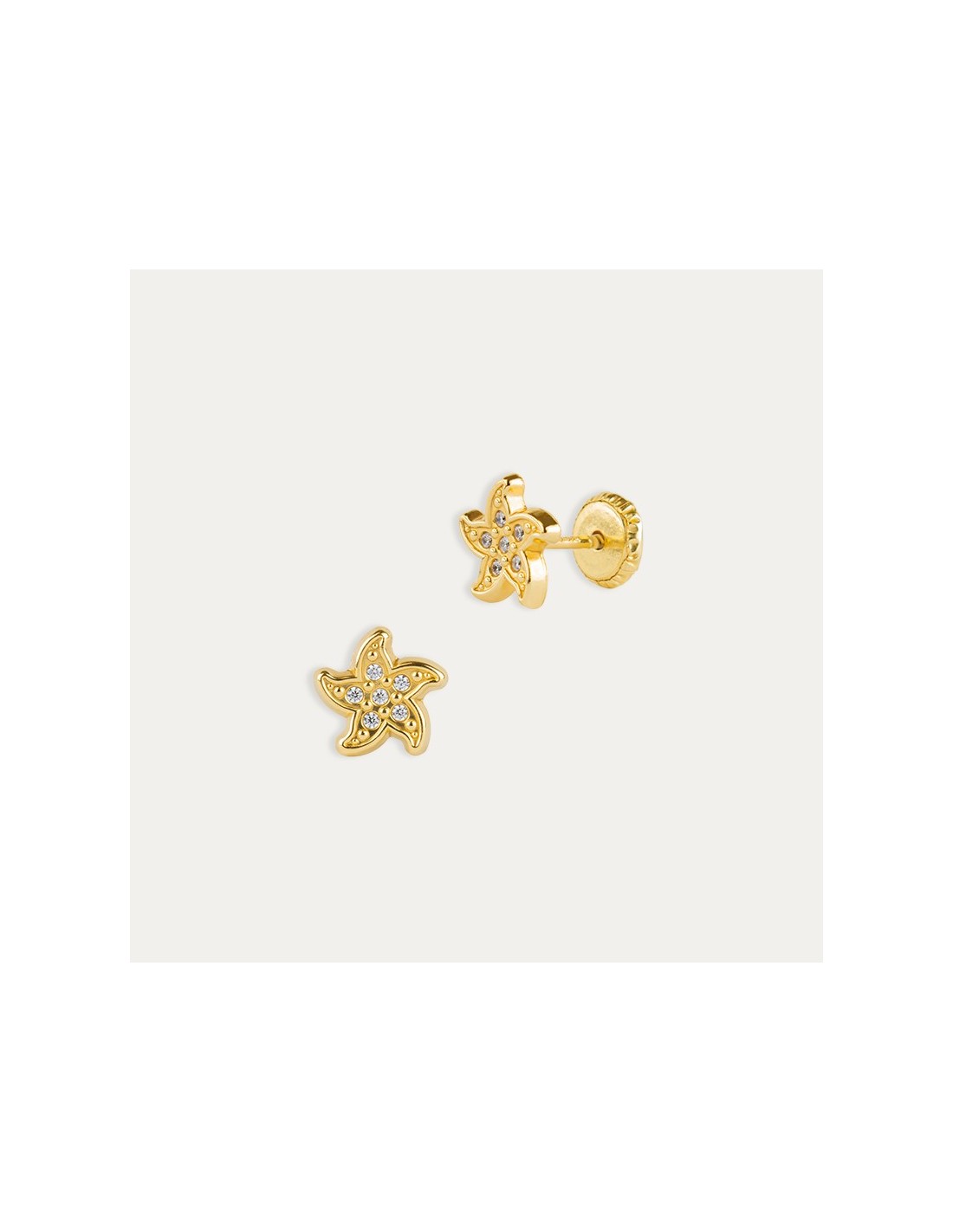 Pendientes de oro de 9 quilates con pequeñas estrellas de mar con circonitas en su interior.