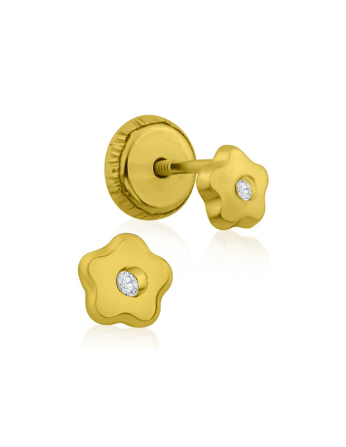 Fabricados en oro 9K , con forma de flor y acabados en brillo pulido. Cuentan con una circonita engastada dentro del motivo de su diseño, un pendiente ideal para tu bebé.