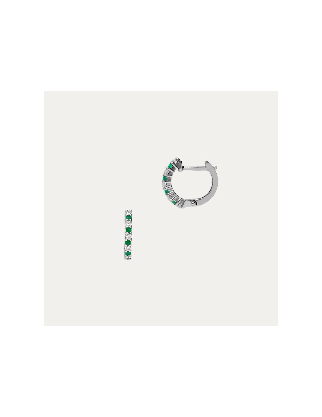 Pendientes en Oro 18k blanco en aro con diamantes creados y esmeraldas en carril engastados en garras con cierre de ballesta.