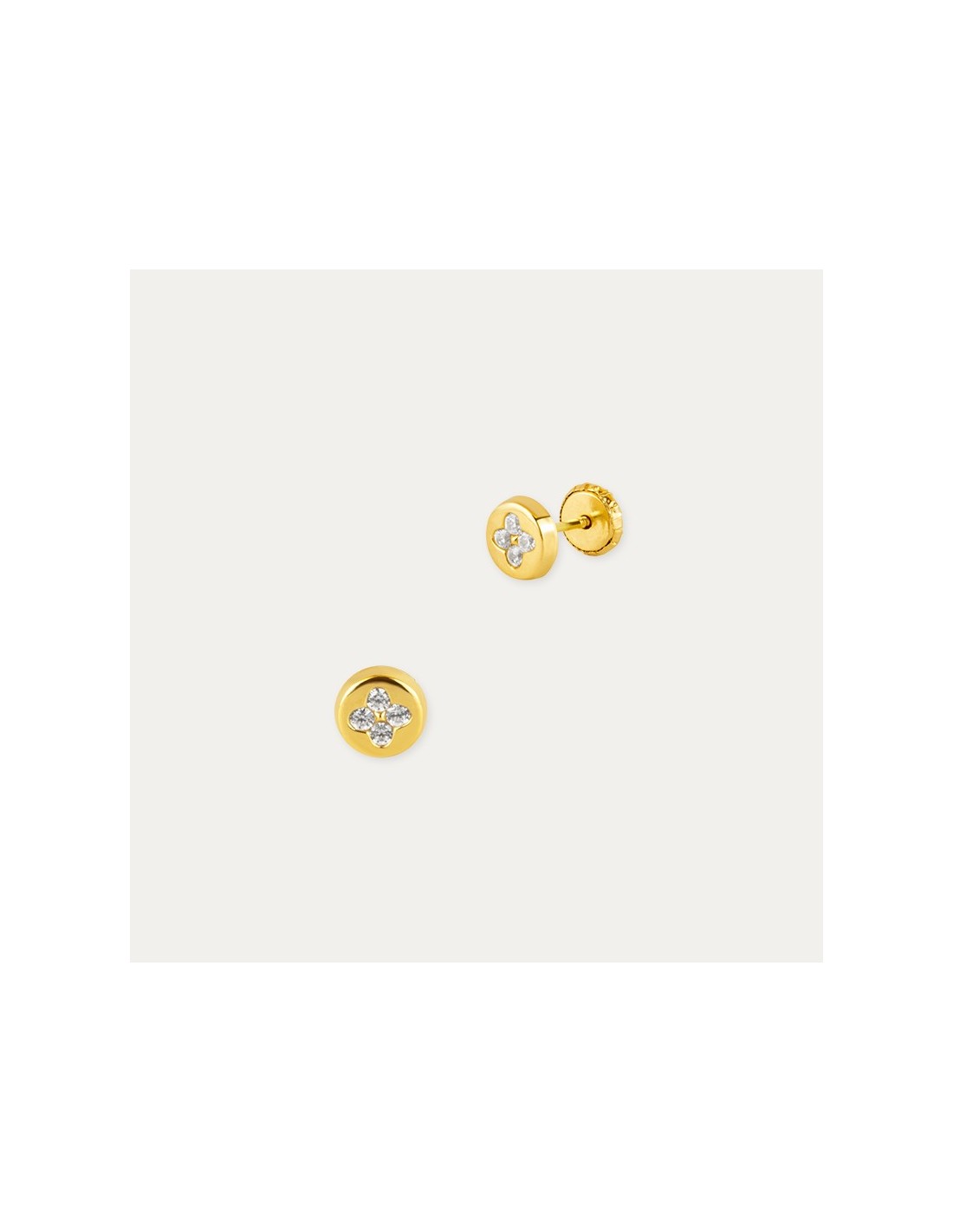 Pareja de pendientes infantiles en Oro de 18 kilates con forma de disco y cuatro circonitas decorando el interior, el cierre es de tuerca para aportar mayor seguridad.