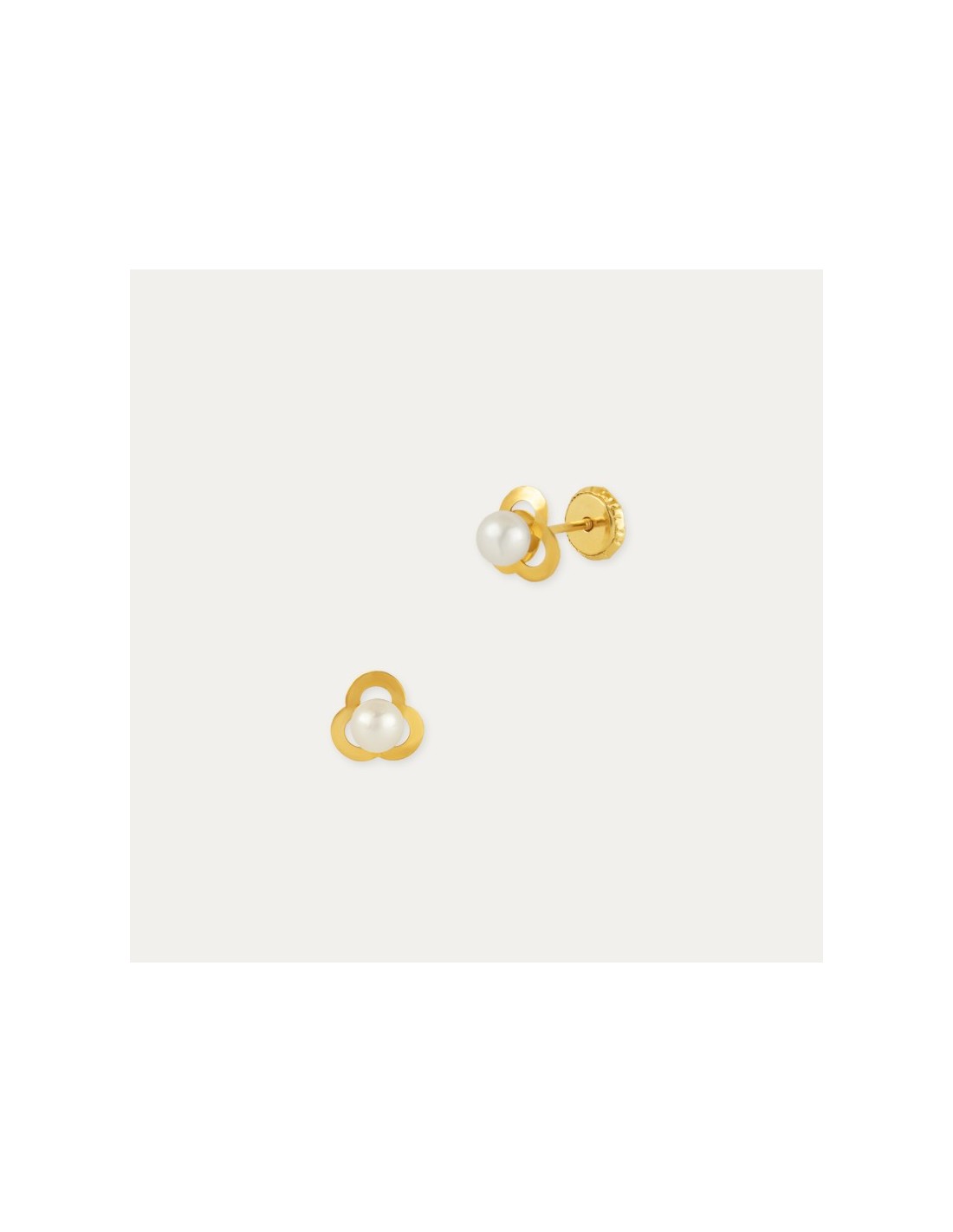 Par de pendientes infantiles fabricados en 18 kilates con forma de flor y una perla en el interior, lleva tres pétalos hacia el interior.