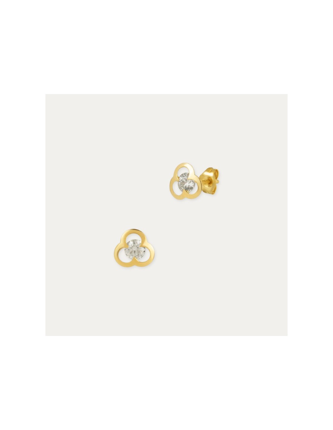 Pareja de pendientes infantiles en Oro de 18 kilates con forma de flor con tres pétalos y una circonita en el centro. Perfectos como complemento para la Primera Comunión.