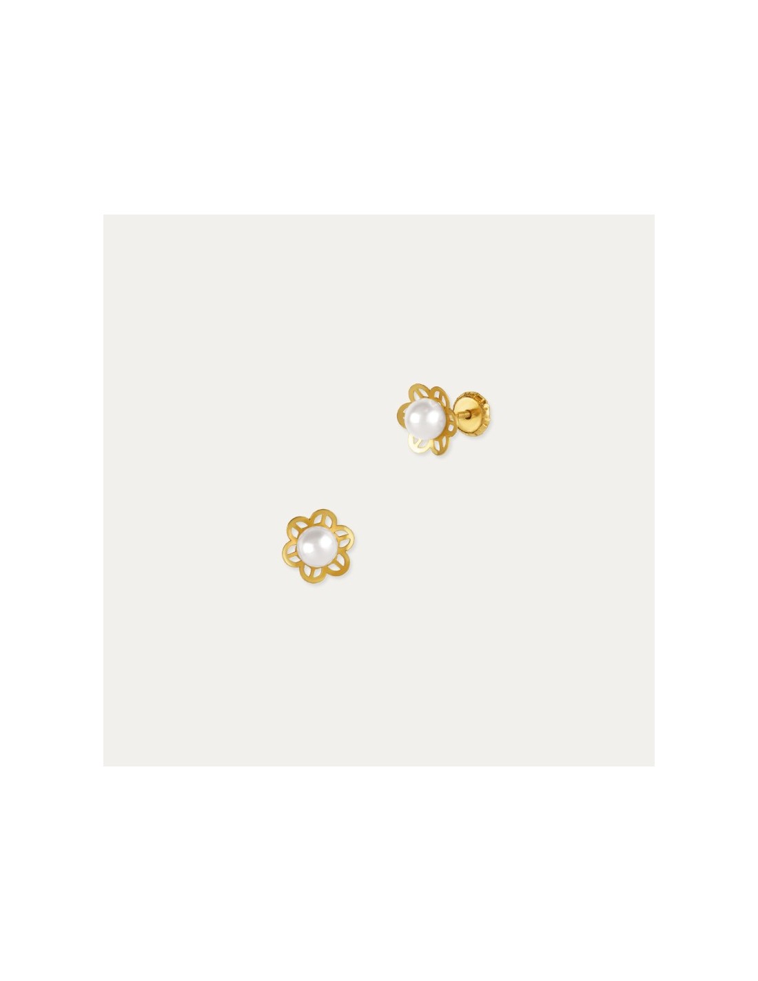 Pareja de pendientes fabricados en Oro de 9 kilates en forma de flor con los pétalos troquelados y una perla en el centro, los podrás combinar con multitud de estilos.