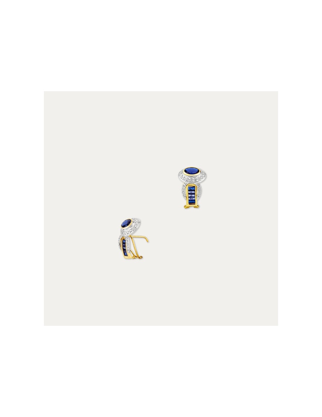 Par de pendientes en Oro 18 kilates con motivos en oro blanco, piedras color zafiro y circonitas. Llevan cierre omega, cómodo y fácil de utilizar.