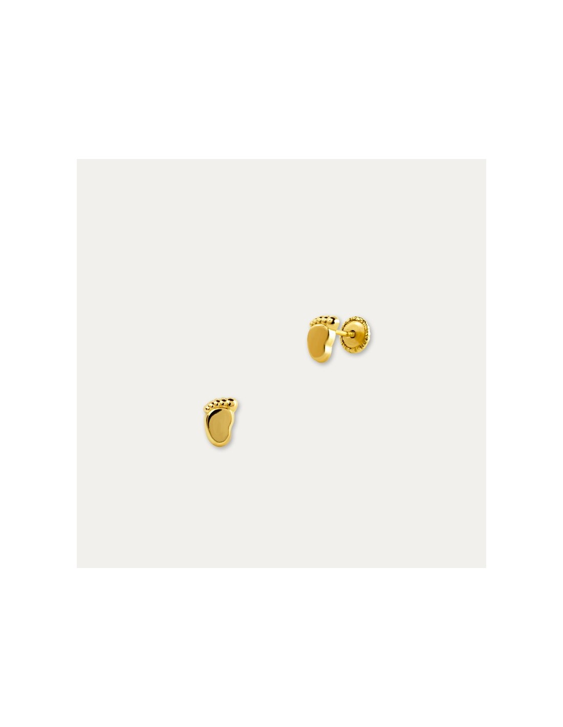 Pendientes en Oro de 9 kilates con forma de huella de pie en acabado brillo, con cierre estilo tuerca ideal para no perder este precioso complemento.